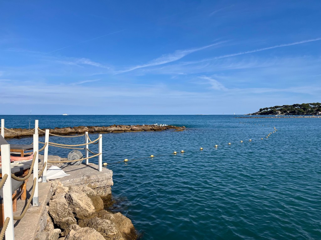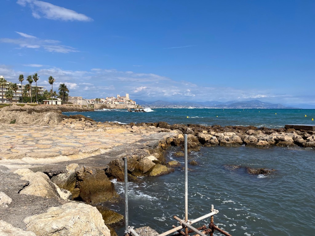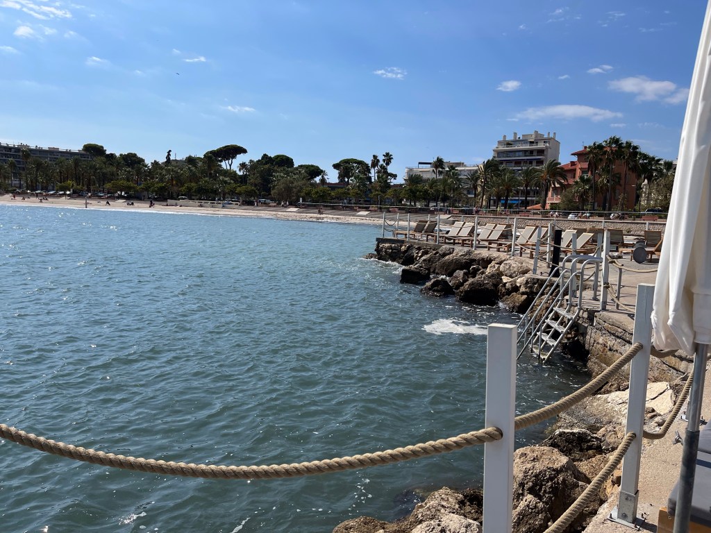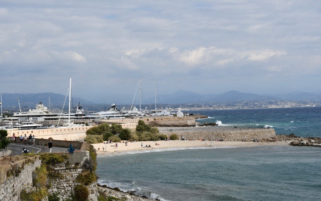 En sortant de la vieille ville, le long du boulevard de l’Amiral Leclerc, tout à côté de la Pointe de l’Ilet, où l’hôtel Royal Antibes que nous habitions possède sa plage privée, on trouve la seconde plage publique d’Antibes: la plage du Ponteuil. Bien que dépourvue de services publics, elle est immensément populaire auprès des familles locales, particulièrement durant les fins de semaine. Elle reçoit également une école de voile dont on voit le joli déploiement quand le Mistral se fait collaborateur.